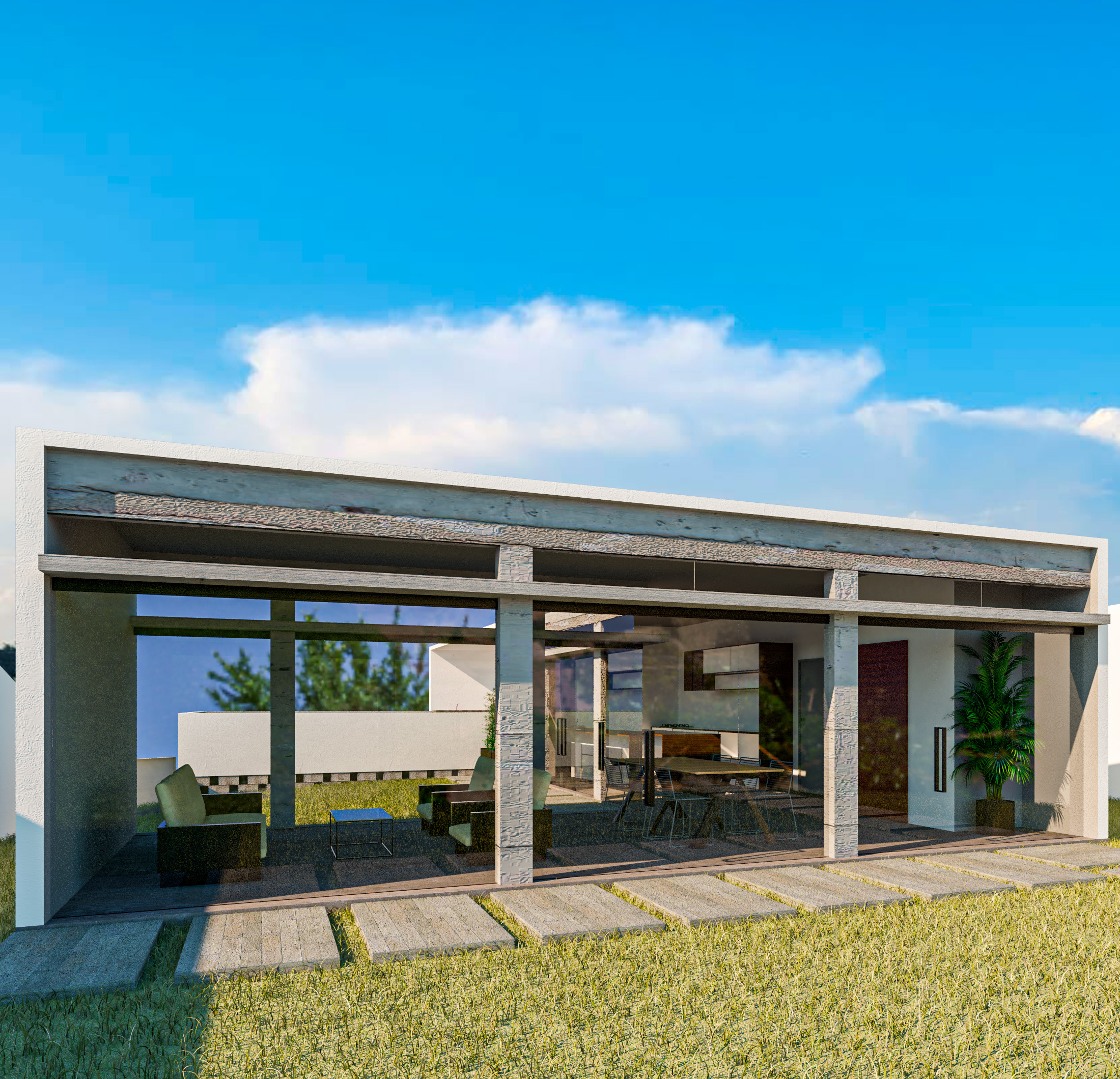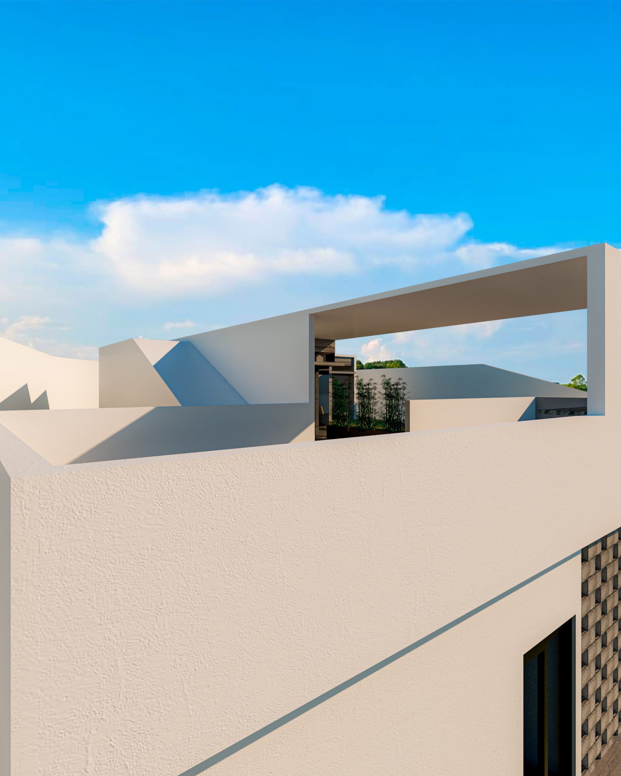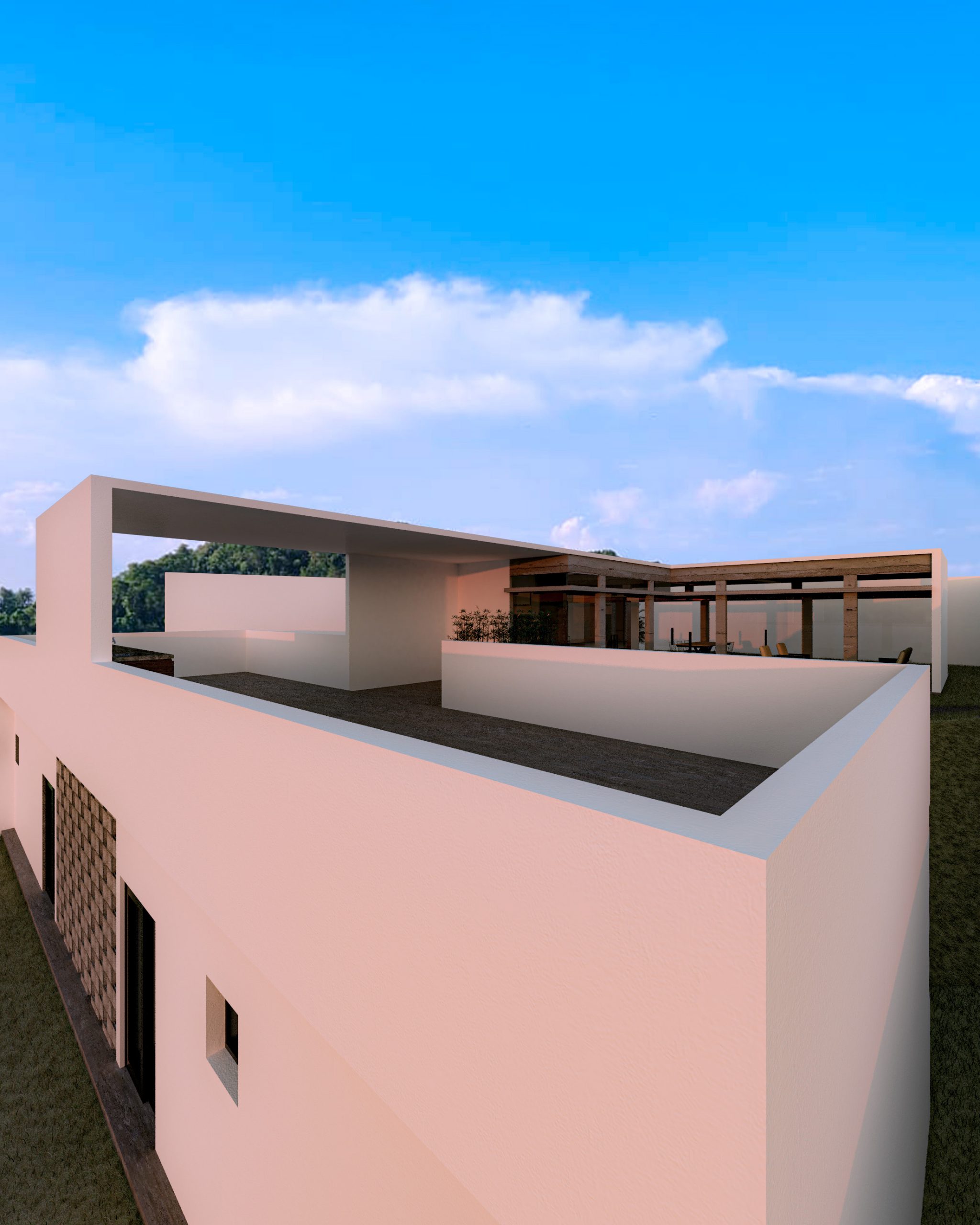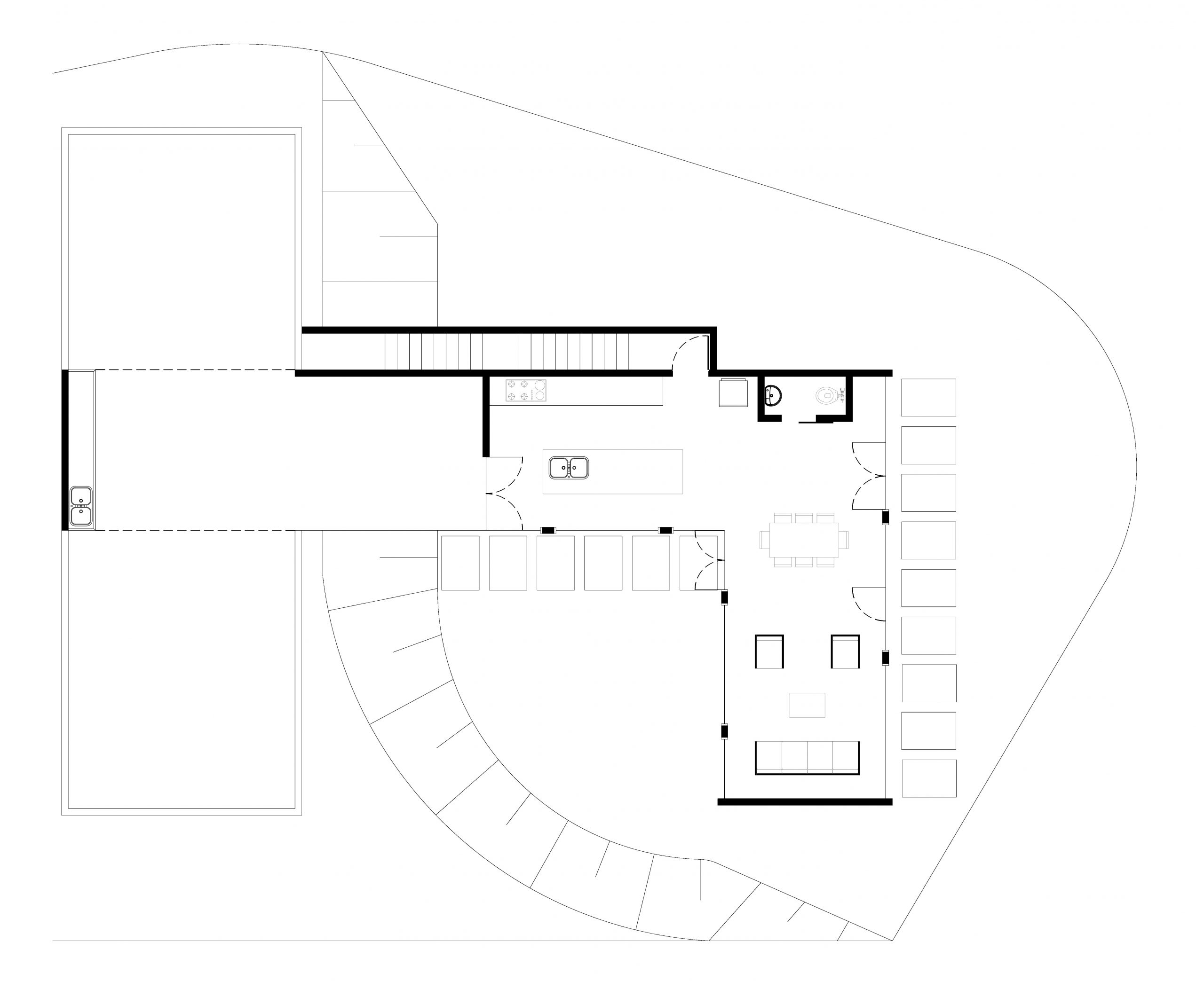 A casa é composta por dois pavimentos: no térreo estão as áreas sociais e de convívio integradas; no pavimento inferior encontram-se os dormitórios, com sacadas voltadas para a vista, e uma sala de TV. A proposta aproveita o declive do terreno, combinando soluções técnicas com integração à paisagem natural.