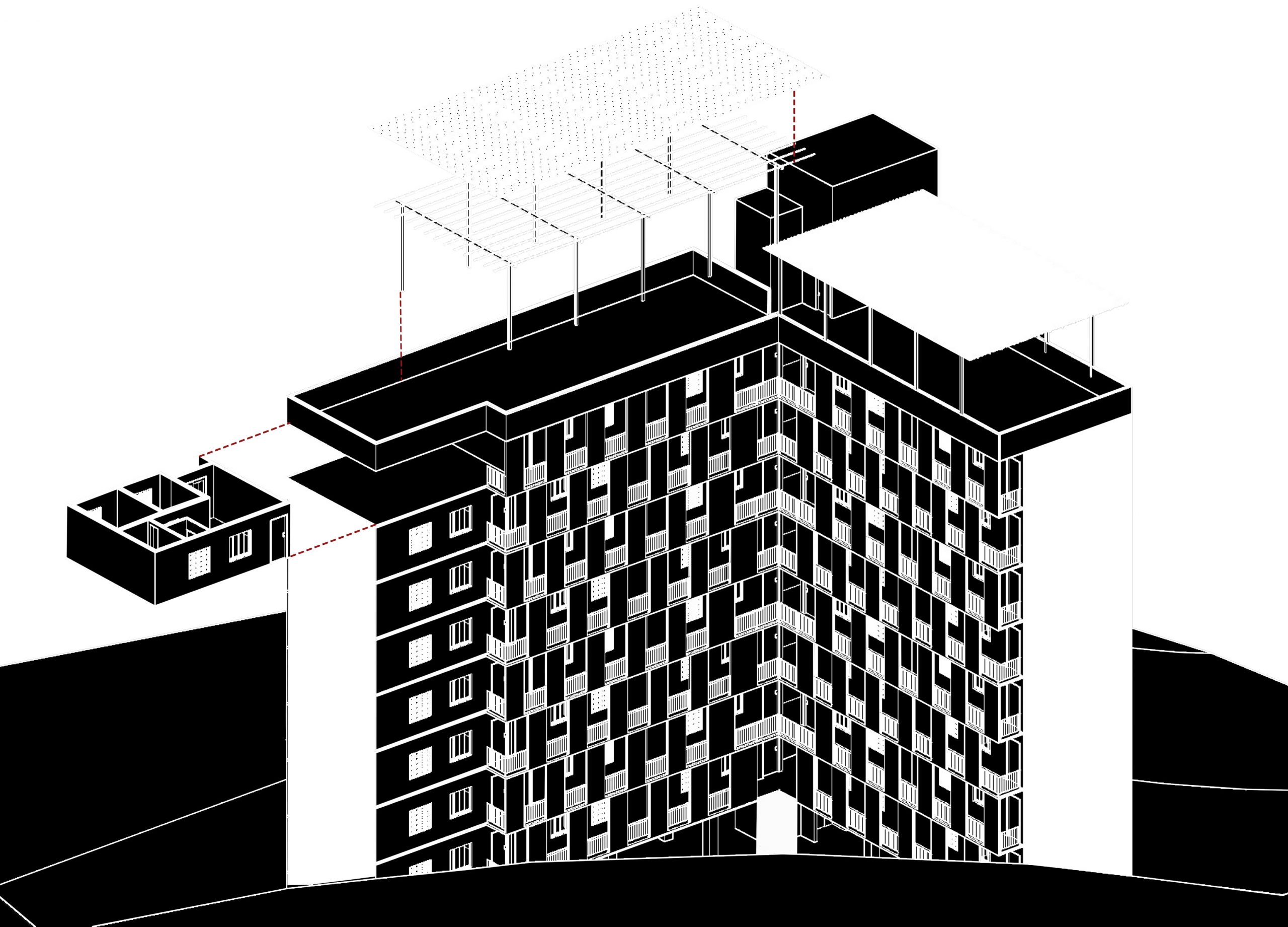 Este prédio foi encomendado por uma associação de moradores em um dos poucos terrenos disponíveis na região da COHAB Tiradentes. O projeto residencial teve como principal conceito a distribuição vertical do programa de atividades: as unidades habitacionais foram posicionadas entre o térreo e a cobertura, onde os espaços de lazer e áreas comunitárias foram concentrados pensando na moradia para além do abrigo. Outro aspecto significativo do projeto foi a topografia do terreno, a implantação do edifício seguiu o platô estabelecido pela terraplenagem original, preservando as áreas verdes e sua vegetação nativa.